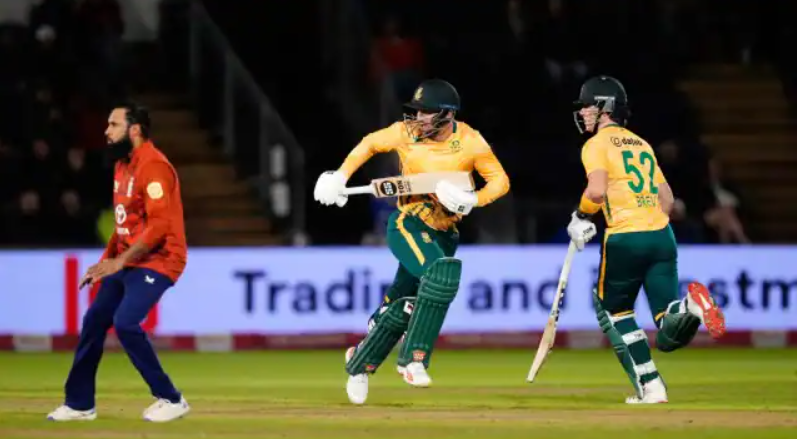 इंग्लैंड के लिए सॉल्ट और बटलर ने पहले विकेट के लिए 126 रन की साझेदारी कर टीम को मजबूत शुरुआत दिलाई। बटलर 30 गेंदों पर आठ चौकों और सात छक्कों की मदद से 83 रन बनाकर आउट हुए। इसके बाद सॉल्ट ने जैकब बेथेल के साथ मिलकर दूसरे विकेट के लिए 95 रनों की साझेदारी की। बेथेल 14 गेंदों पर 26 रन बनाकर पवेलियन लौटे। सॉल्ट फिर भी टिके रहे और शतक लगाने में कामयाब रहे। उनका साथ देने कप्तान हैरी ब्रूक उतरे और दोनों बल्लेबाजों ने तीसरे विकेट के लिए 83 रनों की अविजित साझेदारी कर डाली। सॉल्ट 60 गेंदों पर 15 चौकों और आठ छक्कों की मदद से नाबाद 141 और ब्रूक 21 गेंदों पर पांच चौकों और एक छक्के की मदद से 41 रन बनाकर नाबाद लौटे। लक्ष्य का पीछा करते हुए दक्षिण अफ्रीका के लिए कोई बल्लेबाज बड़ी पारी नहीं खेल सका और उसे 146 रन से करारी हार का सामना करना पड़ा।