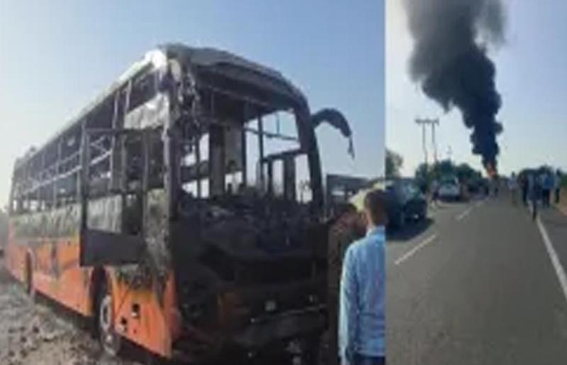 जैसलमेर में चलती निजी बस में भीषण आग, कई यात्री झुलसे।