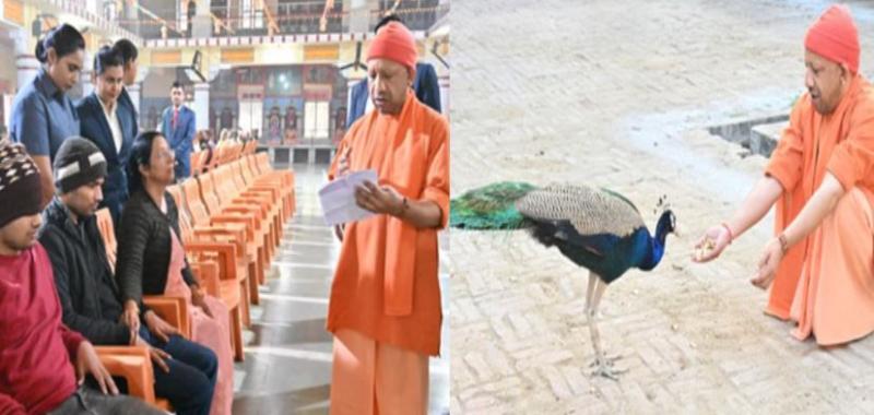 मंदिर की गोशाला में पहुंचकर गोसेवा की। गायों और गोवंश को स्नेहिल भाव से गुड़-रोटी खिलाया। गोशाला में सीएम योगी के पहुंचने पर प्रायः एक मोर भी उनके पास आ जाता है। मुख्यमंत्री ने उसे भी दुलारा और अपने हाथों से रोटी खिलाया।